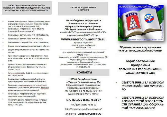 Слушатели получили представление о существующей нормативно правовой базе всех уровней — от Российской Федерации до МОГО «Ухта» по вопросам безопасности жизнедеятельности, им были даны семинары по оказанию первой и психологической помощи пострадавшим. По общему мнению слушателей, реализованная программа систематизировала сведения и данные, дала новые знания, умения и навыки, позволила сформировать необходимые компетенции в вопросах комплексной безопасности образовательных организаций.